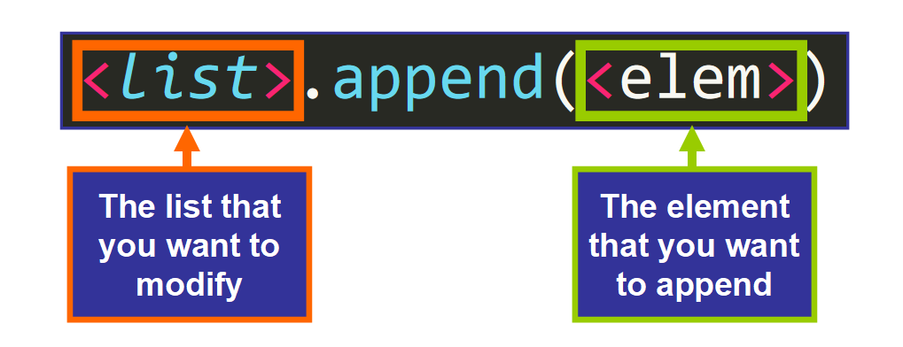 نکته: نقطه از اهمیت زیادی برخوردار است ، زیرا ()append یک روش است. وقتی متدی را فراخوانی می کنیم ، از نقطه بعد از لیست استفاده می کنیم تا نشان دهیم می خواهیم آن لیست خاص را "اصلاح" یا "تأثیر بگذاریم".